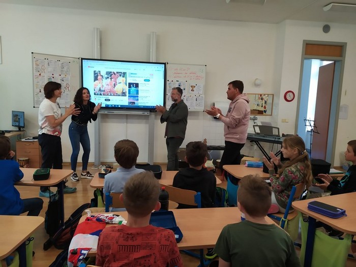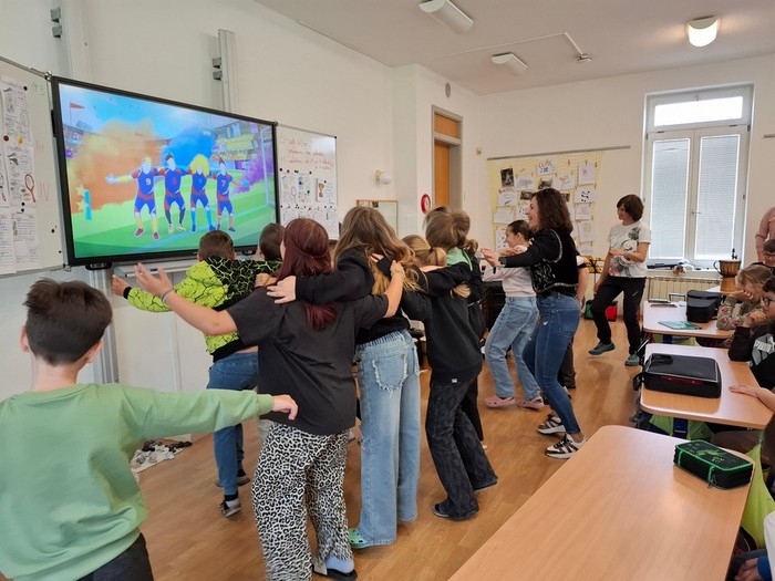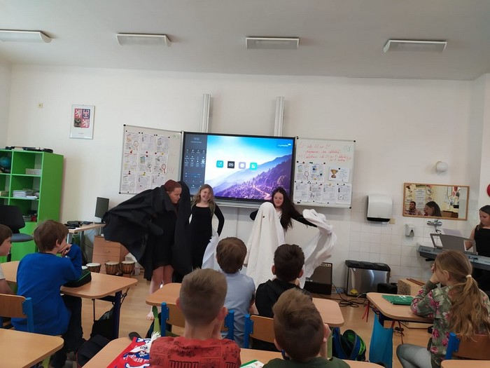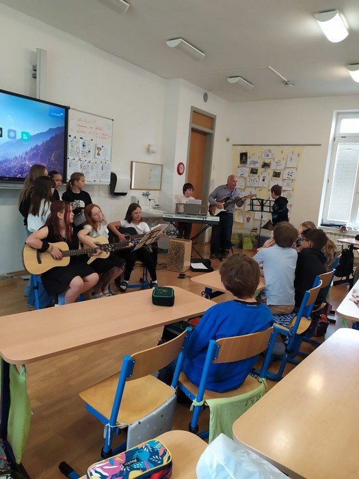 Netradiční hudebka do které se zapojili i učitelé ze Španělska. Zahráli jsme jim písničky a melodie, společně jsme hráli na zvonkohru, pocket drums, bubínky jembe, cajon a tančili JustDance. A velký zážitek - Španělé nám zatančili jejich národní tanec flamengo.