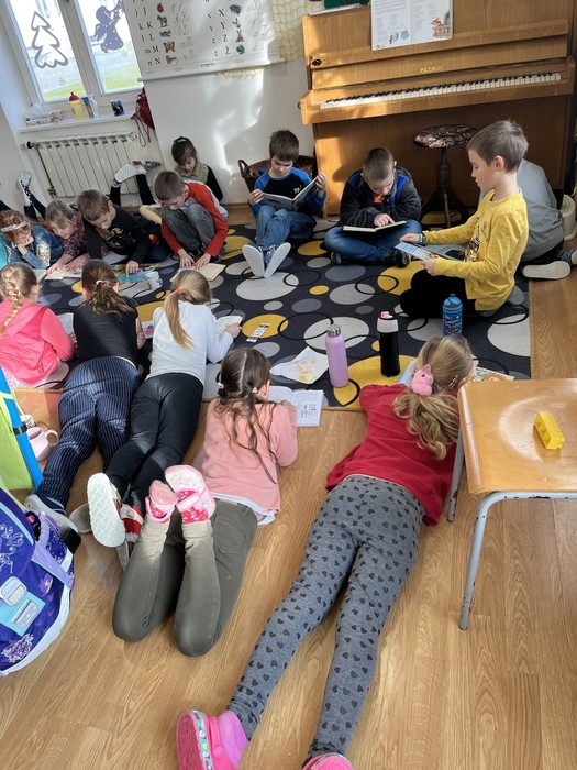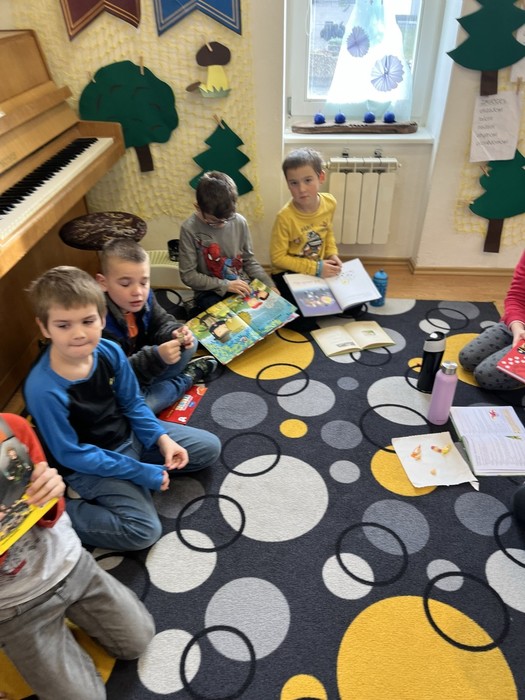 Založili jsme novou milou každotýdenní tradici - Knižní čaje. Paní učitelka uvaří hrnec dobrého čaje, děti si přinesou knihy, které čtou, ukáží je spolužákům, povypráví jim o nich, pak si spolu čteme a na památku na přečtenou knihu pak namalujeme list do portfolia - našeho čarodějného deníku. Tak příště zase šípkový :-).