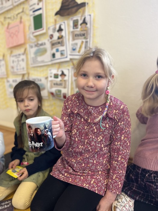 Založili jsme novou milou každotýdenní tradici - Knižní čaje. Paní učitelka uvaří hrnec dobrého čaje, děti si přinesou knihy, které čtou, ukáží je spolužákům, povypráví jim o nich, pak si spolu čteme a na památku na přečtenou knihu pak namalujeme list do portfolia - našeho čarodějného deníku. Tak příště zase šípkový :-).