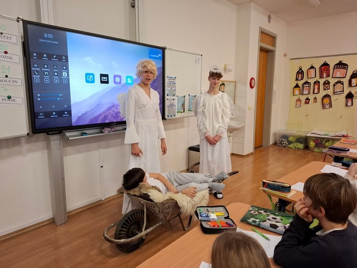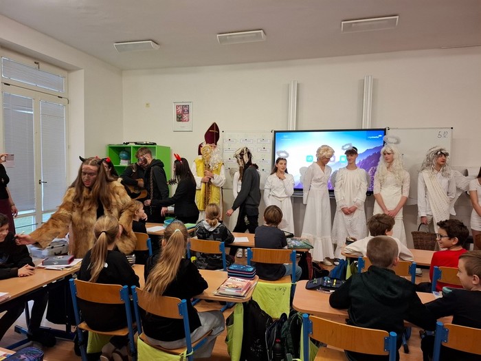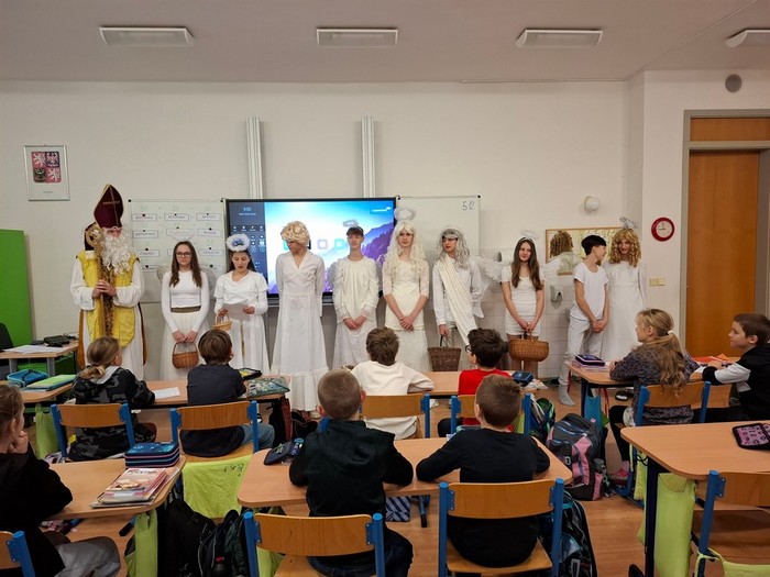 I naši třídu navštívil Mikuláš se svojí družinou andělů a čertů. Protože jsme byli hodní, tak nikoho čerti neodnesli do pekla :-) Ale všechny nás pomalovali i pana učitele.