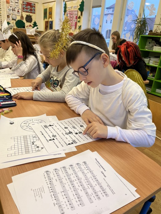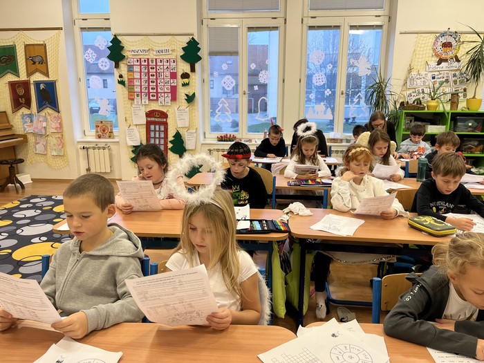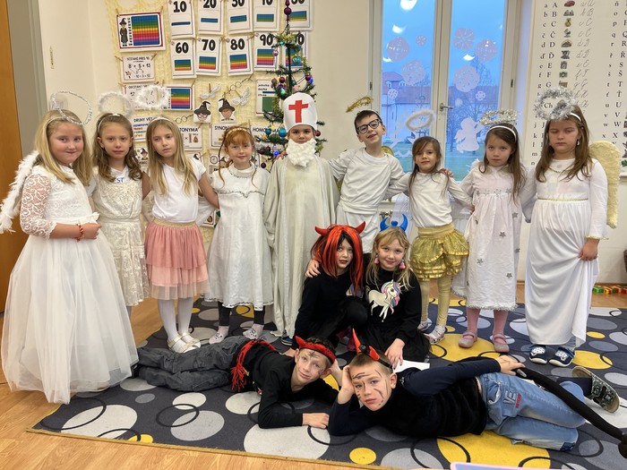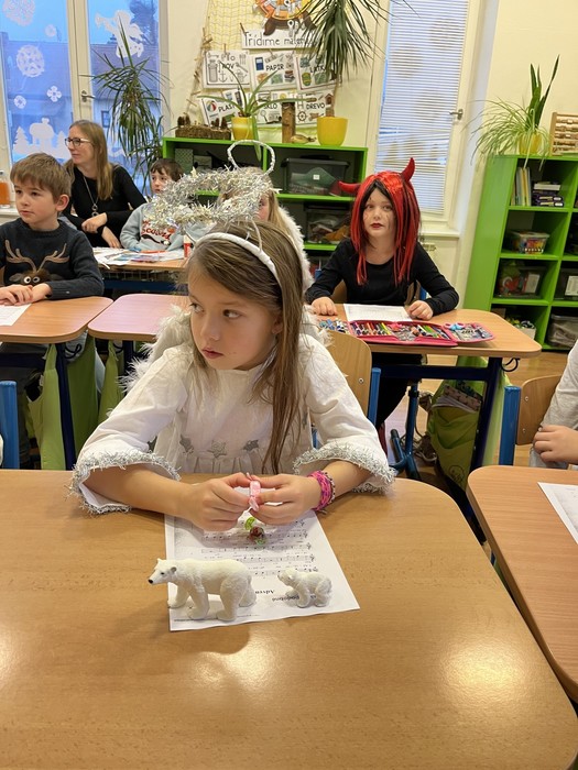 S Mikulášem jsme v přichystaných pracovních listech četli, počítali, recitovali, ponořovali se do představ, luštili křížovku... Se zbytkem školy jsme se sešli v hale na mikulášském setkání. A pak k nám přišla ještě čertice Luciferka... Za okno nás přišla ještě pozdravit naše spolužačka Viktorka, na kterou se moc těšíme a přejeme hodně zdraví!
