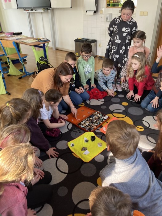 Naše šikovná paní asistentka nás dnes zasvětila do tajů mineralogie. Mohli jsme si prohlédnout, osahat i přiblížit mikroskopem roztodivné polodrahokamy. Byla to krása.