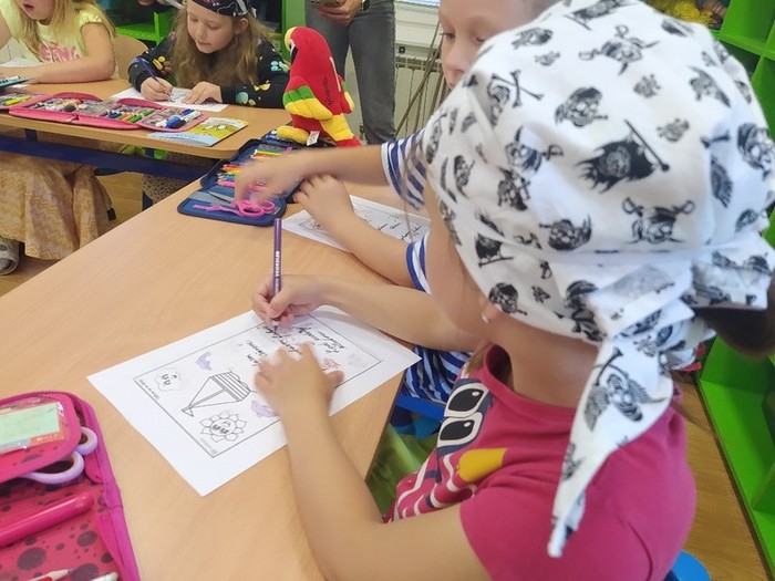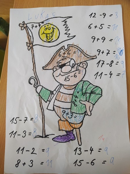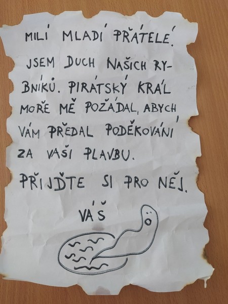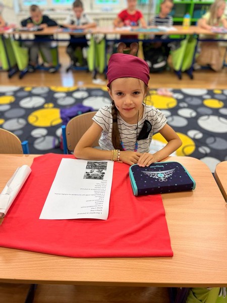 Piráti a námořníci se dnes sešli v první třídě, aby společně s Hupem a Hopem, dvěma opičáky z pohádky, prožili den na moři. Přečetli jsme si pohádku. K ní jsme měli připravený kvíz s otázkami k textu. S piráty jsme četli, psali, počítali i malovali... Museli jsme se prokousat mapou k pokladu, která byla plná nástrah. Našli jsme tajemný vzkaz v lahvi od ducha našich rybníků, který nám u rybníka přichystal odměnu za naši pohádkovou plavbu první třídou. Škola nás moc bavila.