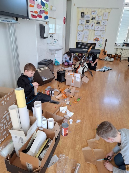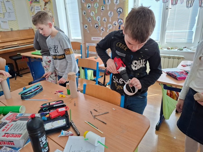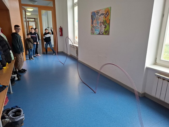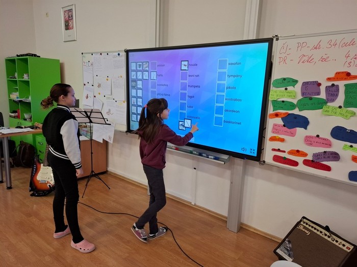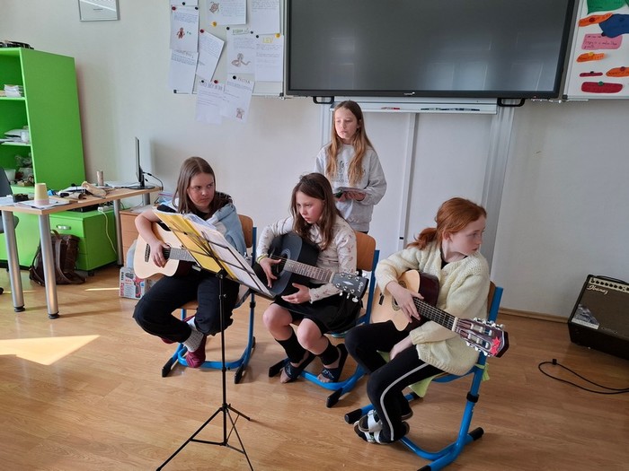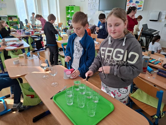 Projektový týden jsme začali písní Hlavně, že jsme na vzduchu. Pak jsme si povídali o tom, jak zvuk souvisí se vzduchem. Jak se zvuk šíří ve vlnách. Demonstrovali jsme vlnění na kapající vodě do vody v kyblíku a tvořili jsme vlny pomocí lana. Zabývali jsme se frekvencí a vlnovou délkou, rychlostí zvuku ve vzduchu a ve vodě, intenzitou zvuku, měřili jsme hluk pomocí aplikace Sound meter, zkoumali jsme barvu a výšku tónů a poznávali jsme zvuky hudebních nástrojů. Hudební nástroje jsme také poznávali v aplikaci Wordwall, LearningApps a pak jsme si zasoutěžili v kvízu hudebních nástrojů v aplikaci Kahoot. Vyráběli jsme i vlastních hudebních nástroje – kazoo, bubínky, píšťalky a telefon „Šeptáček“. Hráli jsme na sklenice naplněné vodou a užili jsme si muzicírování s naší kapelou Class Stars.