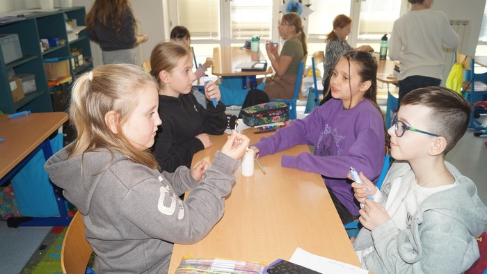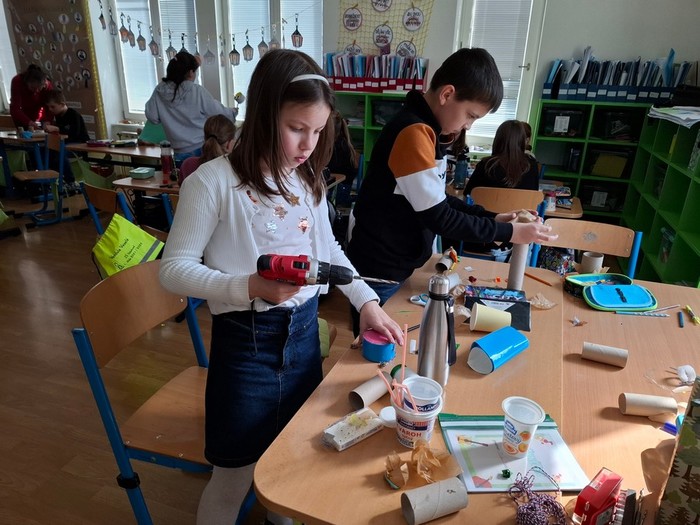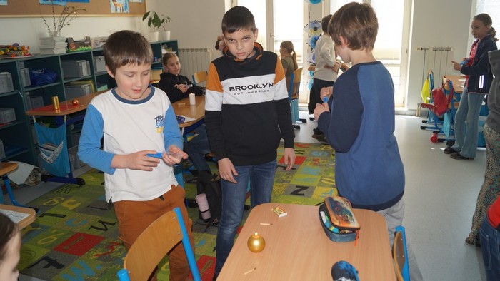 Poslední den projektového týdne čtvrťáci zakončili badatelskou výukou s paní učitelkou Kateřinou Švecovou a Kamilou Hozíkovou. Celý den je provázel Zvěd Junior, který jim pomocí videí vysvětloval: Co je to vzduch? Jaký význam má životadárný vzduch? Jak vzniká počasí a jak funguje proudění vzduchu? Pokusy, které prováděl, si čtvrťáci názorně ukázali a poté i sami vyzkoušeli. Vážili vzduch, počítali jeho obsah, stlačovali ho pomocí injekčních stříkaček a sfoukávali svíčku proudem vzduchu. Vyrobili autíčka poháněná balónkem, skládali složitější vlaštovky, v tělocvičně si ověřili odpor vzduchu s pomocí deštníků. Pomocí fénu nafukovali pytle horkým vzduchem a sledovali, jak se postupně vznášejí. Všechny důležité poznatky si zaznamenávali do badatelských deníků.