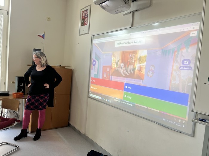Zvládli jsme velikonoční kvíz v Kahootu, první tři místa obsadili Edík, Amálka a Vendulka B., potom jsme se přesunuli k tělocvičně, kde jsme si zasportovali na velikonočních stanovištích - jeli jsme na oslu, trefovali vajíčkem volské oko, skládali kříž a dali si vajíčkový florbalový slalom. Za splněné úkoly jsme obdrželi indicie a na konci vyluštili šifru: Turínské plátno. To jsme si potom šli naživo prohlédnout do muzea nad Informačním centrem.