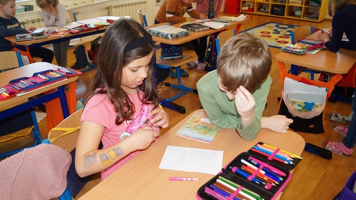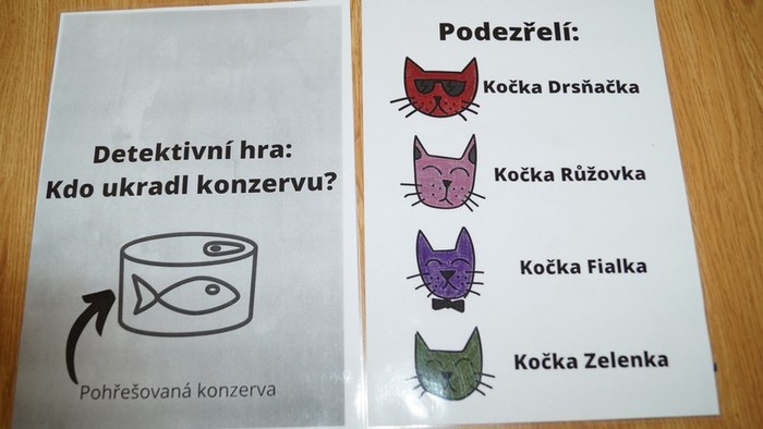 Hráli jsme si na detektivy a řešili zapeklitý případ. Kdo ukradl konzervu s tuňákem? Nejenom, že jsme zjistili všechny indicie, ale dokonce jsme konzervu našli. Byla ukrytá v tělocvičně, jen místo tuňáka v ní byly čokoládové bonbony od Angeliky. Ty nám dala na rozloučenou a také na brzké shledání.