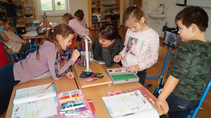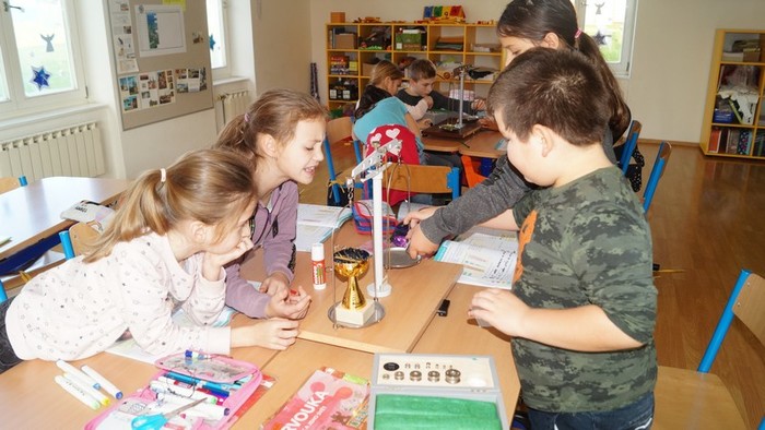 a učíme se vážit na dvouramenných vahách, je to velké dobrodružství. Naše předměty jsme vážili v gramech. Příště se pokusíme najít něco, co budeme moci zvážit v jednotkách větších, třeba v dag (dekagramech).