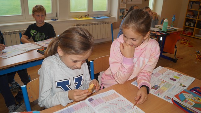 Paní Veronika Mergentalová nás přišla pozvat do kroužku přírodních detektivů. Přinesla na ukázku větvičku jeřabin a kousek dřeva, kterou uhlodal bobr.