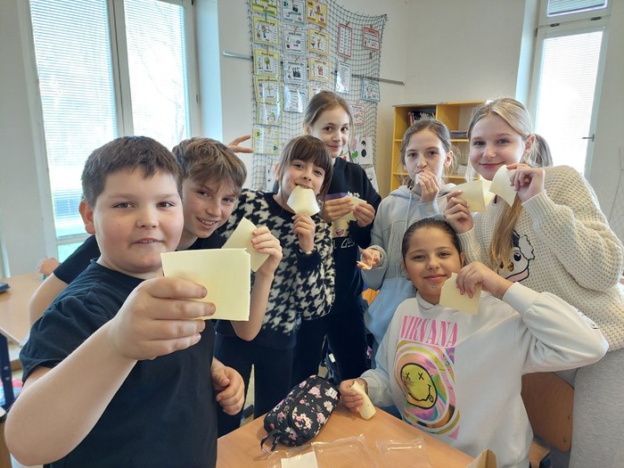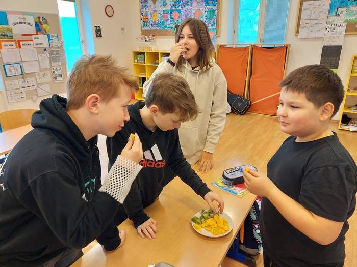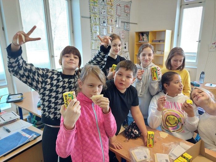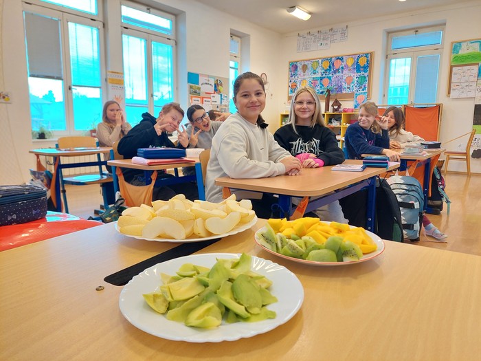 Během týdne jsme si s žáky páté třídy zpestřili výuku ochutnávkou ovoce, zeleniny a mléčných výrobků od firmy Bovis. Postupně vyzkoušeli mango, avokádo, nashi, kiwi, dva druhy sýrů, ochucená žervé i jablečný mošt. Součástí byla i společná snídaně, na kterou si děti donesly i lívance. Celý týden se nesl v příjemné atmosféře plné nových chutí a zdravých dobrot. Děkujeme firmě Bovis za tento skvělý zážitek!