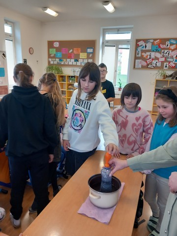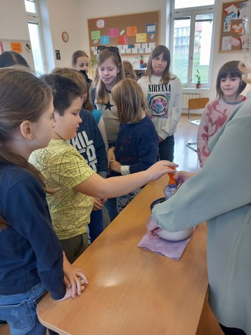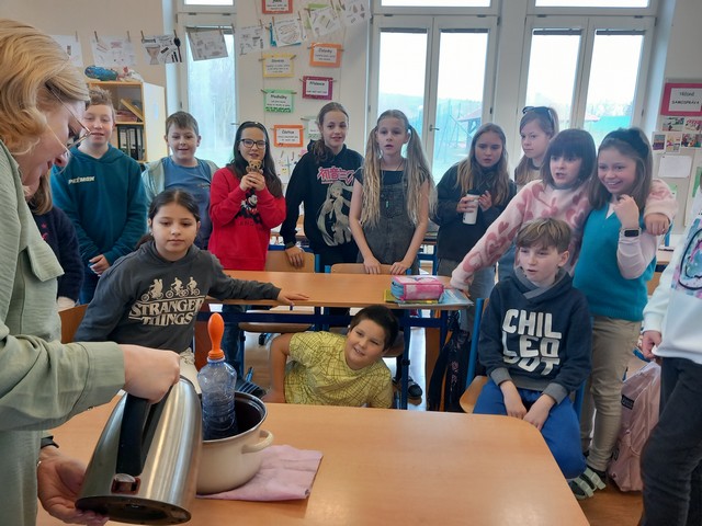 Dlouho očekávanou činností našich čtvrťáku byly tento týden pokusy v rámci výuky přírodovědy. Žáci poctivě přinesli zadané suroviny a pomůcky a vědecká činnost mohla začít! Když v PET láhvi zamrzne voda, bude ledu méně než vody, nebo naopak "naroste"? Rozpustí se cukr a sůl rychleji v teplé, nebo ve studené vodě? Co se stane ve vodě s olejem? Uvidíme po rozpuštění ledu v uzavřeném sáčku také kondenzované kapičky páry? Tyto a mnohé další otázky jsme si tak mohli dnes zodpovědět. Dle nadšených reakcí žáků budeme muset brzy opět nějaké další pokusy zopakovat :-)