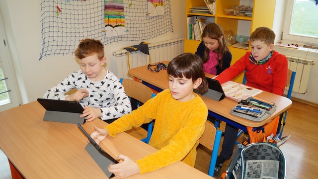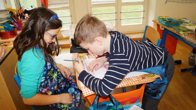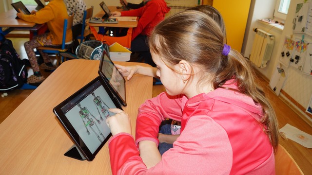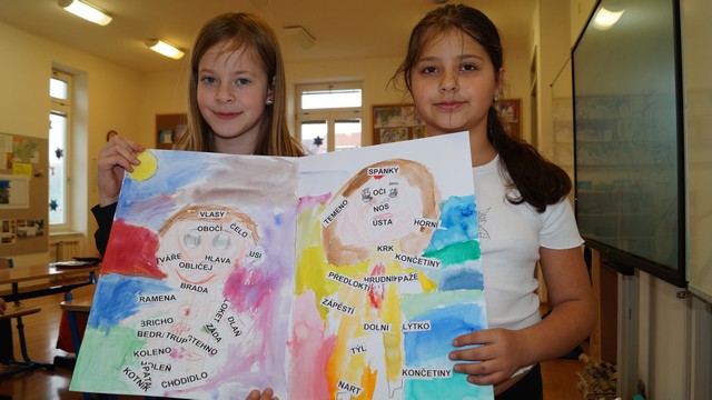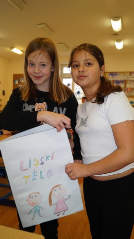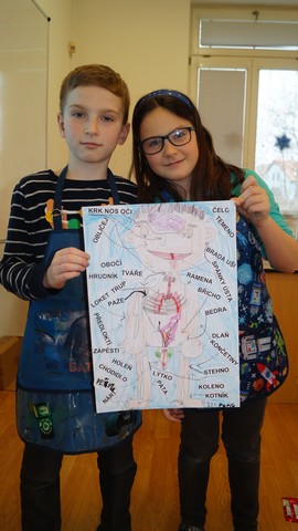 Dva jsou skvělý tým. A tak jsme ve dvojicích poznávali lidské tělo. Nakreslili, vybarvili, nalepili. Mnoho slov z popisků bylo neznámých. Třeba bedra, temeno, týl,... Teď už jsou známá. Své znalosti jsme pak ověřili na iPadech.
