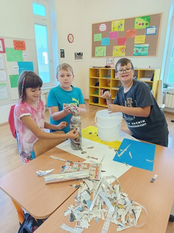 V hodinách pracovních činností u nás probíhala výuka v tandemu, protože k nám do hodiny přišla paní učitelka Katka Kostrhunová, která nám pomohla zrecyklovat odpadový materiál tím, že jsme ze starých novin a pet láhví technikou papírmašé vytvořili zvířátka.