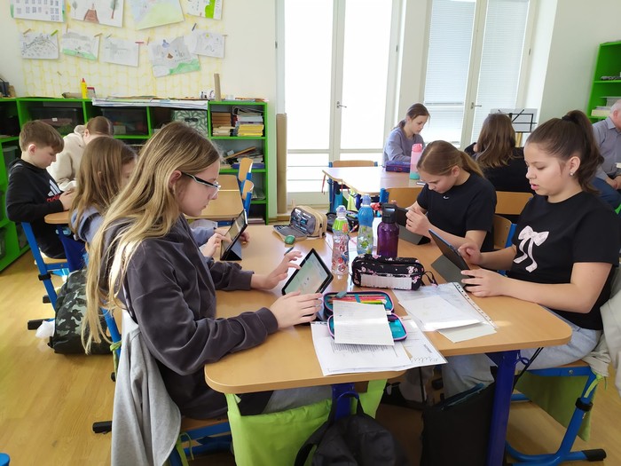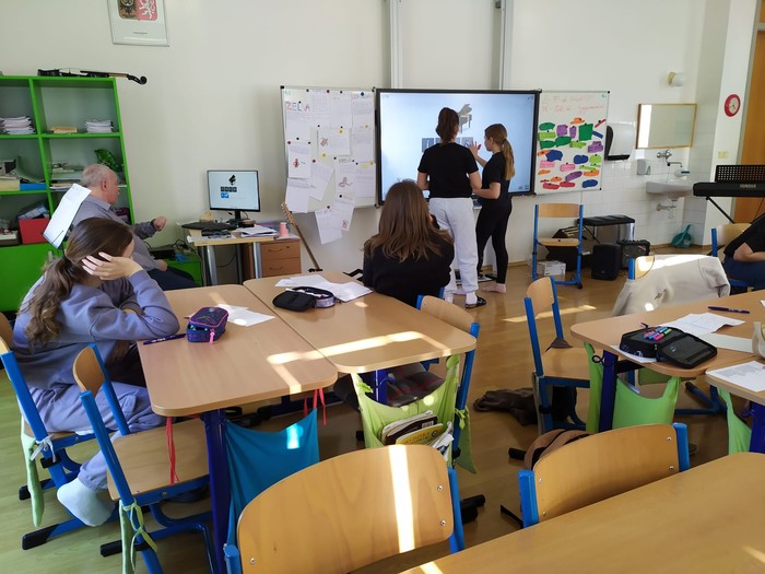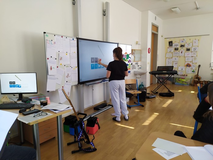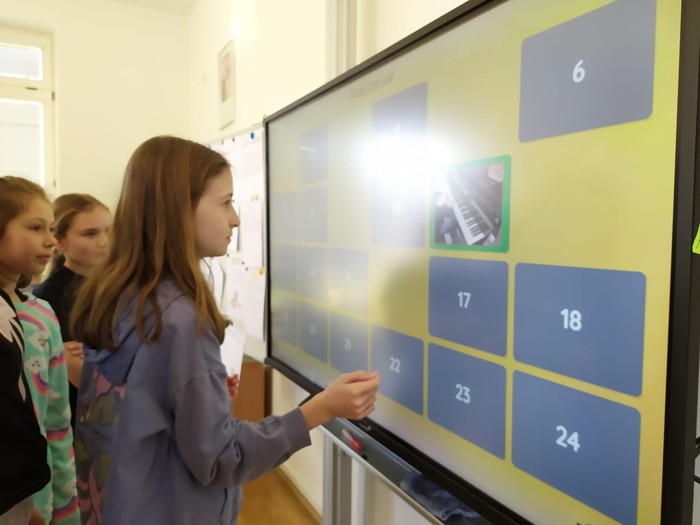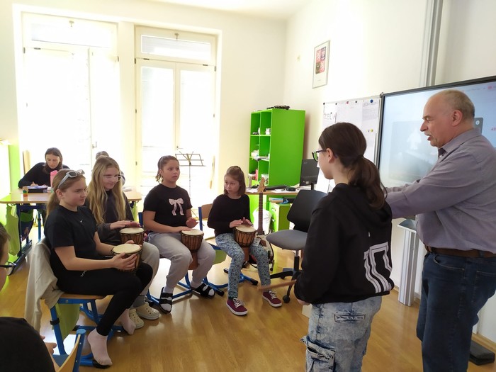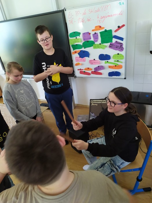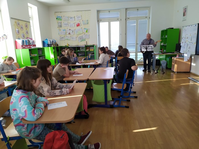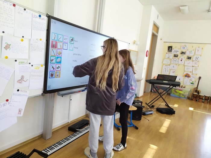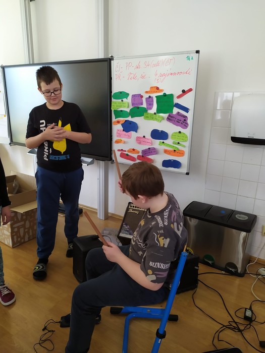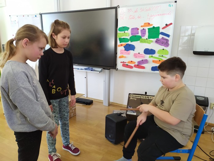 Nechyběly ani interaktivní aktivity – kvízy v aplikaci Kahoot a WordWall, úkoly v LearningApps a týmová hra s hudebním pexesem. Děti si vyrobily vlastní hudební nástroj – Kazoo, hrály na sklenice s vodou, bubnovaly na neviditelné Pocket drums i na opravdové Djembe s doprovodem na kytaru.