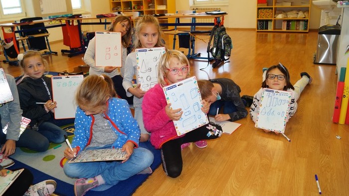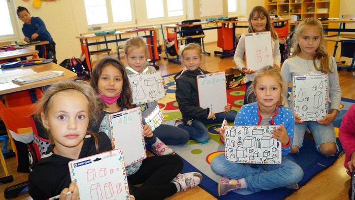 V matematice jsme zkoušeli kreslit tělesa - krychle, kvádry, válce, koule i kužely. Všem se moc práce dařila.