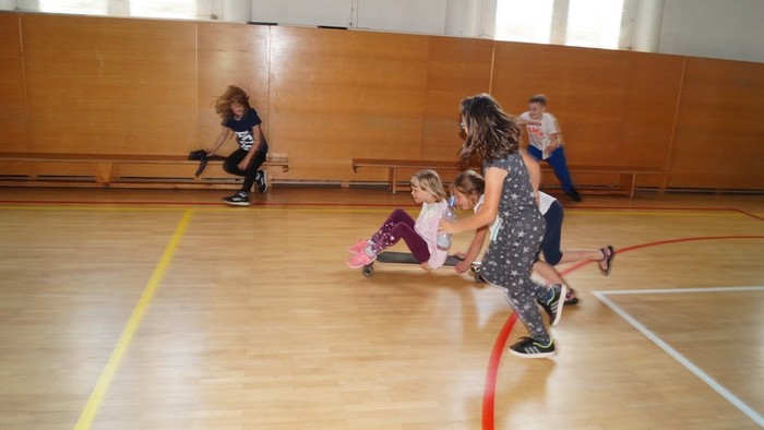 Triatlon se skládal z "jízdy na kole" - to pro nás bylo skákání na míči, běhu a místo pádlování nám čluny nahradil longboard.