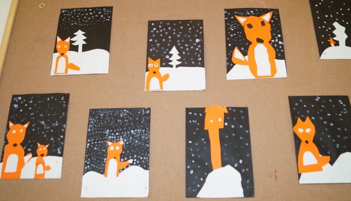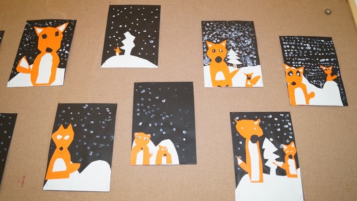 Ve výtvarné výchově i v praktických činnostech jsme velice šikovní, rychlí a také tvořiví. Za pár dní v novém kalendářním roce jsme dokázali vyměnit obrázky na všech nástěnkách. Podařily se nám zimní sporty, lišky, netopýři i vrány. Všechny naše výtvory nám vždycky přiblížily nějakou oblast, o které jsme si povídali - hlavně v prvouce, ale i v jiných předmětech.