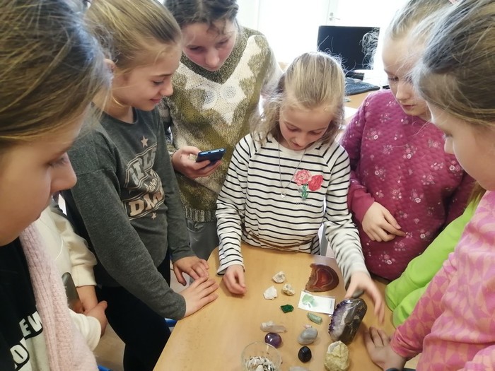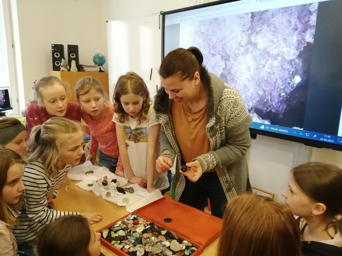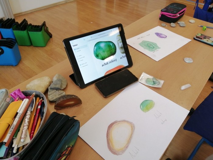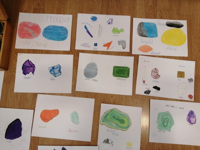 V rámci přírodovědy, výtvarky a pracovních činností zkoumáme horniny a nerosty. Paní asistentka Gabriela nám donesla svoji sbírku minerálů a dozvěděli jsme se od ní spoustu zajímavostí. Horniny a nerosty také zkoumáme pomocí Ipadu a webových stránek, kreslíme je a také jsme si donesli různé kameny a pomocí temperových barev jsme z nich udělali vzácné minerály.