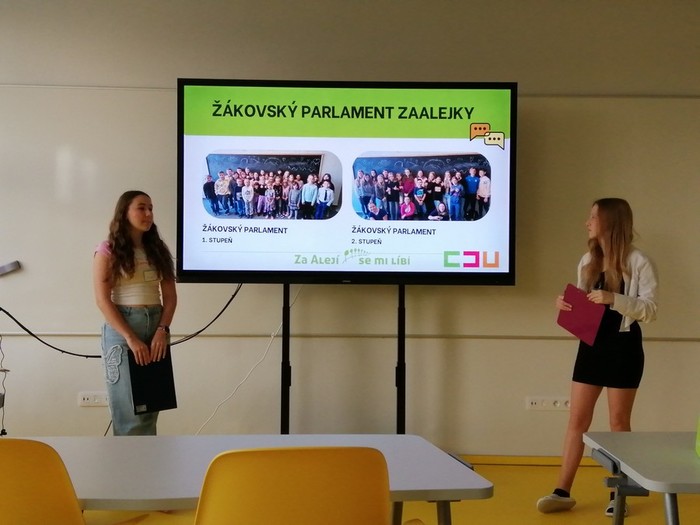 Naše děvčata Nicol a Julie se zúčastnily konference žákovských parlamentů v ZŠ Za Alejí. Holky se dozvěděly spoustu informací o fungování žákovského parlamentu v ZŠ Za Alejí, o aktivitách adaptačních kurzů a také se naučily a zahrály spoustu sociálních her.