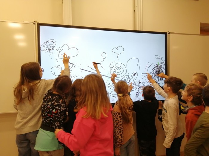 Po jarních prázdninách nás čekalo ve třídě překvapení. Byla to moderní digitální tabule. Hned jsme vyzkoušeli, co všechno taková elektronická tabule umí. Nejen že zobrazuje informace z počítače, ale můžete na ní psát, kreslit, rýsovat elektronickým perem nebo také prstem. Má spoustu aplikací a také vestavěný internet.
