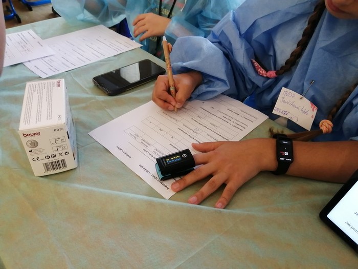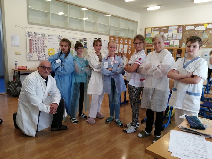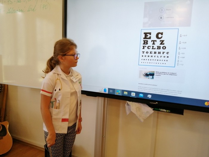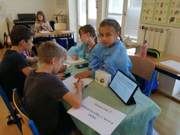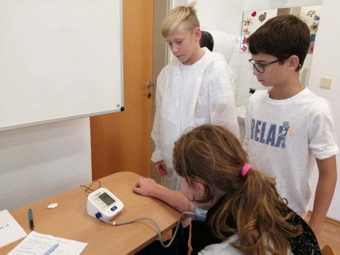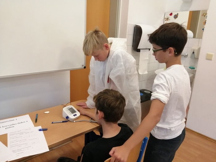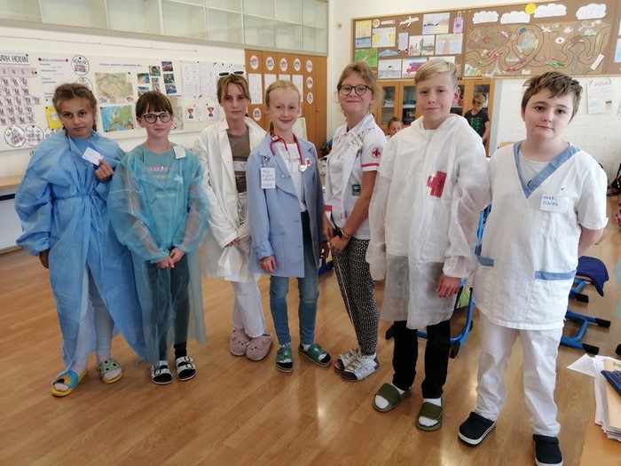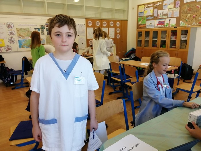 V rámci projektové výuky jsme si vyzkoušeli práci lékařů a zdravotních sestřiček. Měřili jsme krevní tlak, teplotu, hmotnost, zjišťovali jsme množství kyslíku v krvi, testovali jsme zrak, poslouchali fonendoskopem činnost srdce, počítali puls. Všechny naměřené hodnoty jsme zapisovali do pracovního listu, pak počítali průměrný počet tepů za hodinu, den a týden, převáděli jsme hmotnost svého těla na dekagramy a gramy. Počítali jsme aritmetické průměry naměřených hodnot celé třídy. Naši ordinaci také navštívili ředitelé jiných škol a některým jsme dokonce poskytli lékařskou péči.
