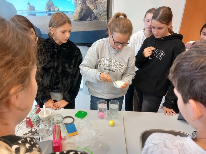 Víte, proč ocet po spojení s jedlou sodou vybublá z nádoby ven? Nebo jak je možné, že těžký golfový míček ve slané vodě plave? Na tyto a mnohé další otázky dokáží naši šesťáci snadno odpovědět díky pokusům, které si sami do hodin fyziky připravují!