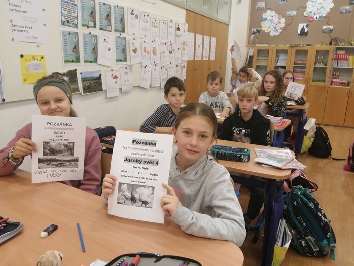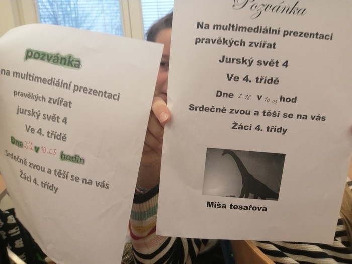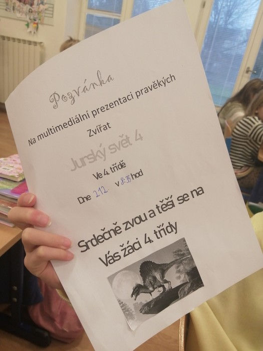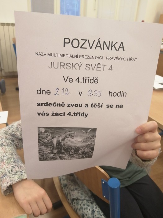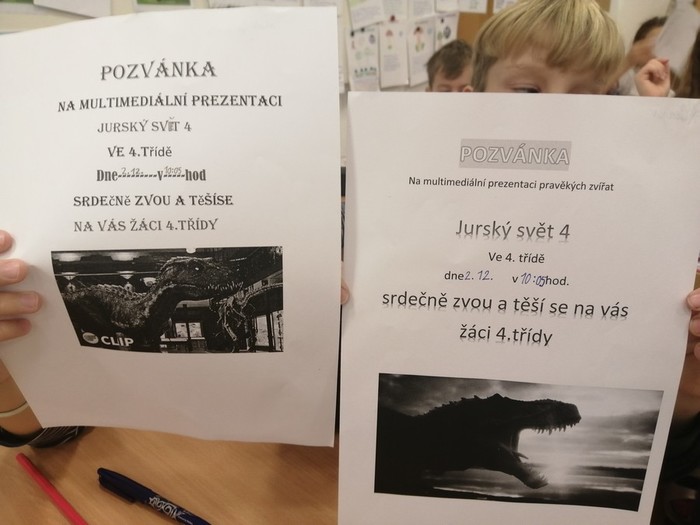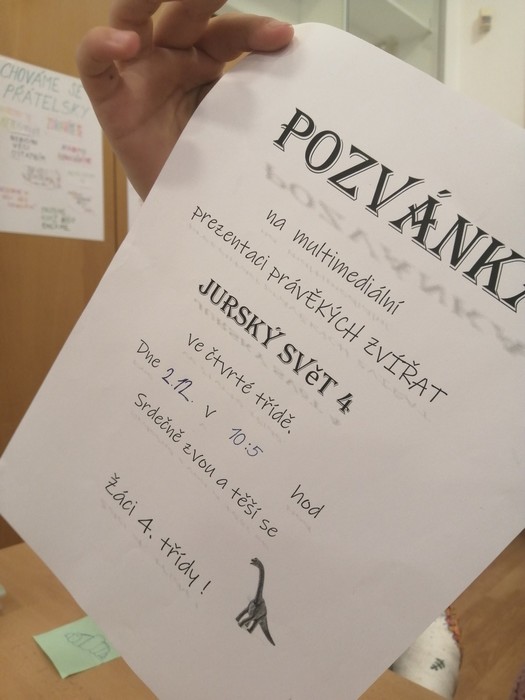 Součástí třídního projektu Jurský svět 4 bylo vyrobit pozvánky a pozvat žáky a učitele na prezentaci projektu. V hodině informatiky jsme se učili pracovat v aplikaci Word, vybrat písmo, velikost, barvu, umístit text na stránce a také správně napsat, vložit obrázek, uložit práci na plochu a odeslat mailem třídnímu učiteli. Pan učitel nám pozvánky vytisknul, my jsme na pozvánku dopsali datum a čas a roznesli pozvánky do tříd.