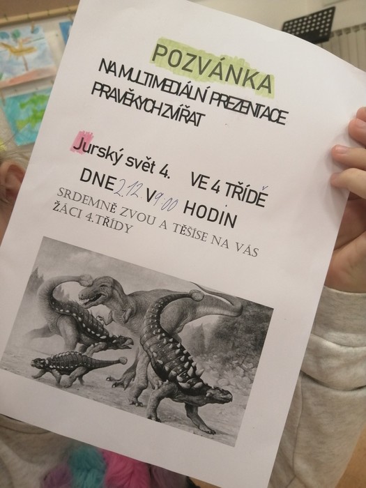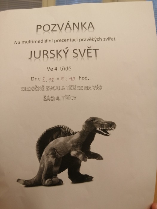 Součástí třídního projektu Jurský svět 4 bylo vyrobit pozvánky a pozvat žáky a učitele na prezentaci projektu. V hodině informatiky jsme se učili pracovat v aplikaci Word, vybrat písmo, velikost, barvu, umístit text na stránce a také správně napsat, vložit obrázek, uložit práci na plochu a odeslat mailem třídnímu učiteli. Pan učitel nám pozvánky vytisknul, my jsme na pozvánku dopsali datum a čas a roznesli pozvánky do tříd.