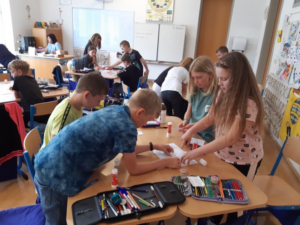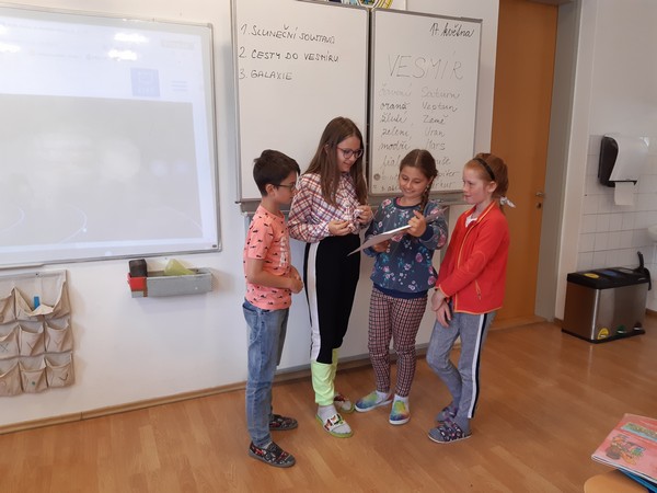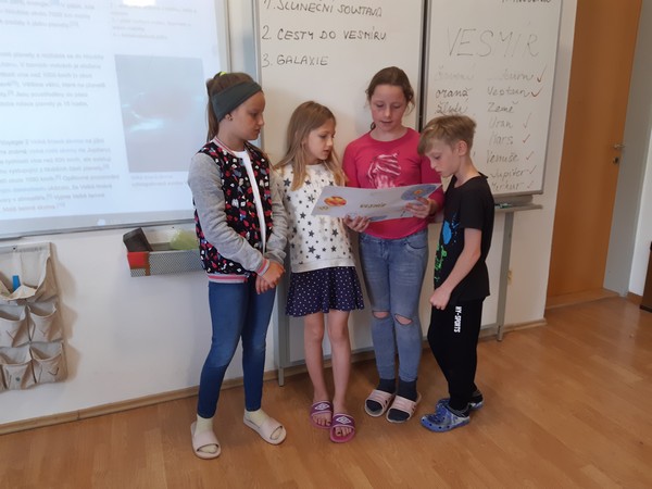 Všechno neznámé a neprobádané v sobě skrývá kouzlo tajemna. My, lidé, toho víme o vesmíru zatím jen velmi málo. V našem projektu jsme si např. na vlastní kůži mohli vyzkoušet, jak dochází k zatmění Slunce a Měsíce. Zajímavým tématem byla taky existence černé díry. O Sluneční soustavě, která je nepatrnou částí neznámého prostoru, už nyní dokážeme popovídat mnoho zajímavostí. Informace jsme vyhledávali z různých zdrojů a to, co jsme zjistili o jednotlivých planetách, jsme pečlivě zaznamenali do našich myšlenkových map. Řešili jsme také matematické skládačky a v pracovním listu museli zavzpomínat na učivo českého jazyka. Planety jsou neuvěřitelně pestré a nám se podařilo zachytit jejich krásu do výtvarné podoby. O cestování do vesmíru lidé odpradávna toužili a díky vědě se jim to nakonec podařilo. I my, máme své sny, a možná se jednou do vesmíru také podíváme.