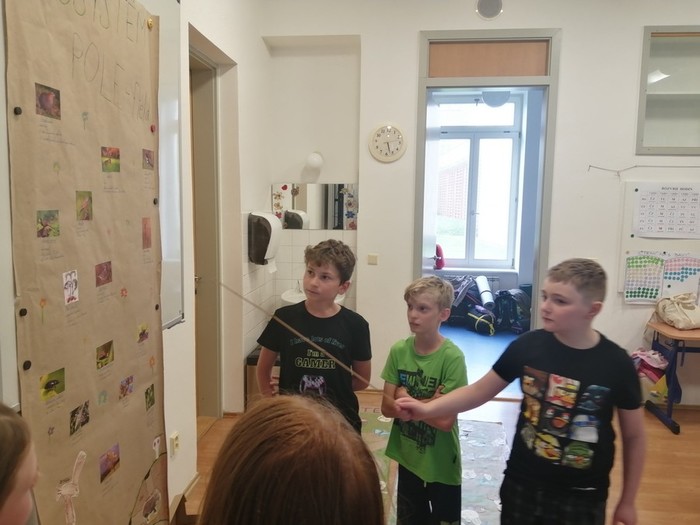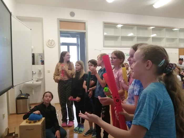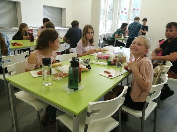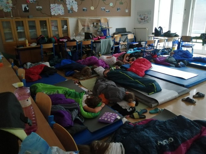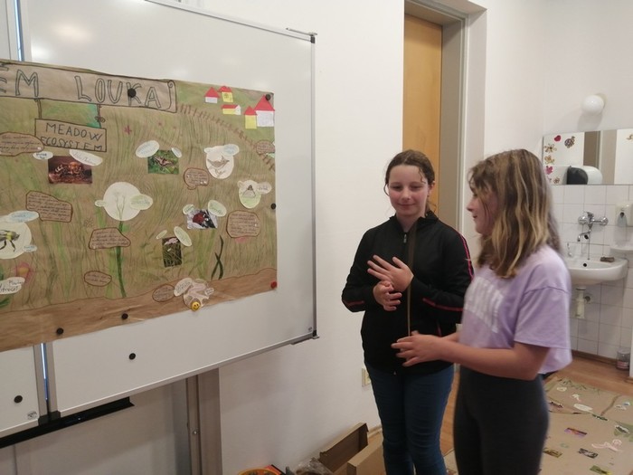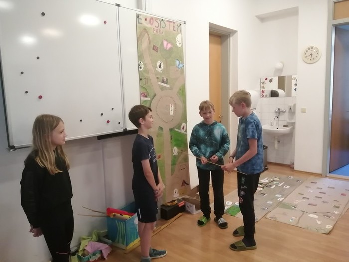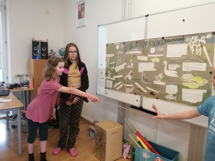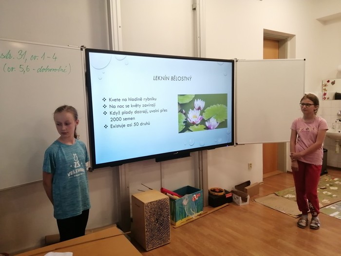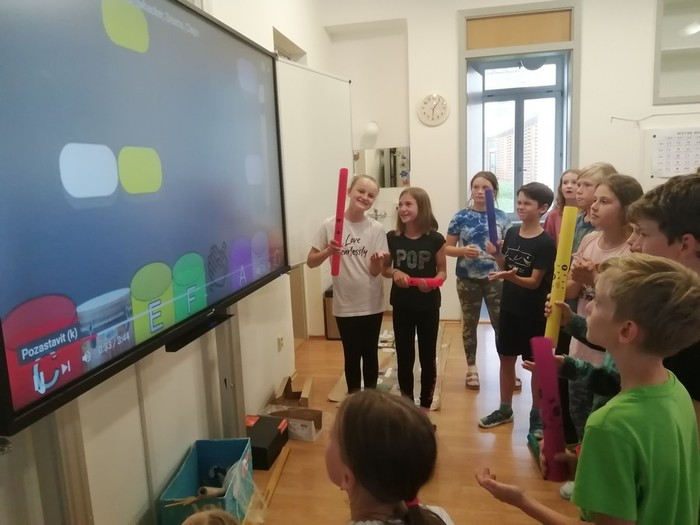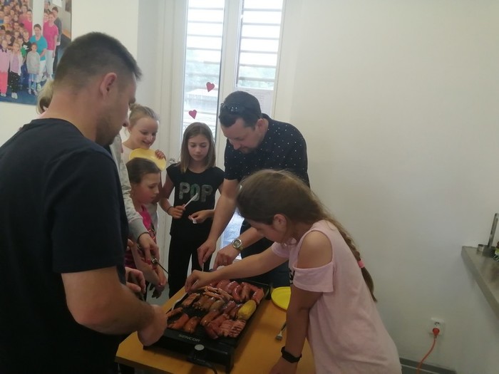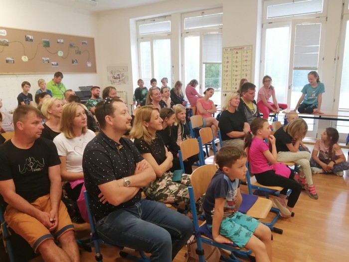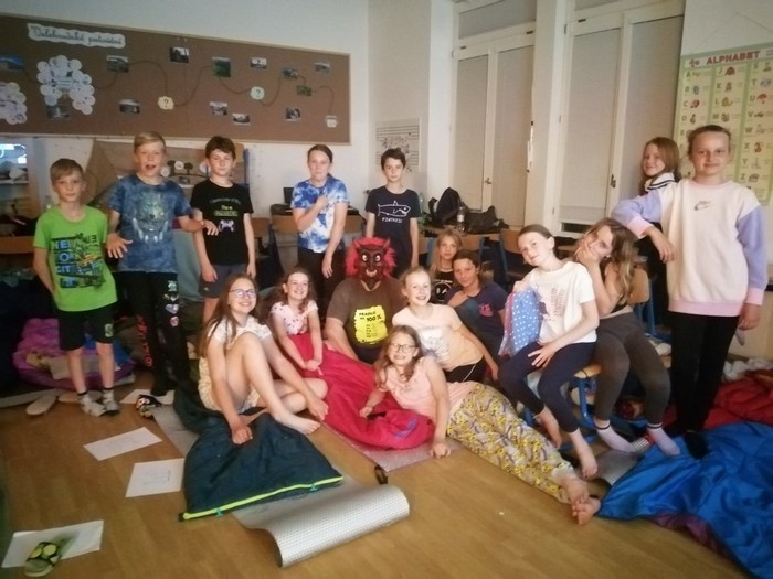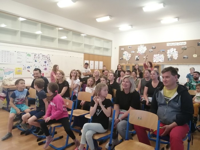 V pátek 9. června jsme pozvali rodiče do školy. Předvedli jsme jim ukázky z našeho projektu Ekosystémy, zazpívali písničky a zahráli na Boomwhackers. Také rodiče si zkusili přírodovědné kvízy a hru na Boomwhackers. Pak jsme si společně trochu zasportovali a zahráli hry v tělocvičně. Na závěr společného setkání byla grilovačka v jídelně. Kolem osmé hodiny večerní nás rodiče opustili a následoval večerní program - diskotéka, stezka odvahy v noční škole s tajenkou, noční procházka k bazilice a focení a na závěr filmeček, u kterého většina z nás usnula. A v noci nás navštívil čert. A protože jsme byli všichni hodní, tak nikoho neodnesl do peklíčka.