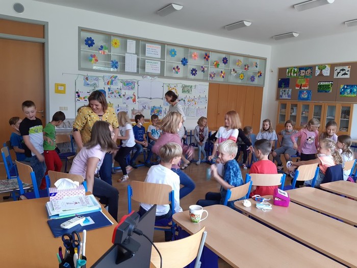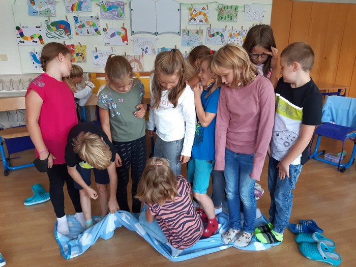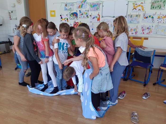 Páteční dopoledne jsme si zpříjemnili setkáním se školní psycholožkou, která si pro nás připravila nejrůznější hry. Užili jsme si při nich spoustu legrace a zároveň si vyzkoušeli, že "táhnout za jeden provaz" se vždy vyplatí. S chutí si zahrály i paní učitelka a paní asistentka.