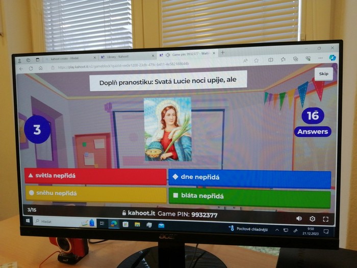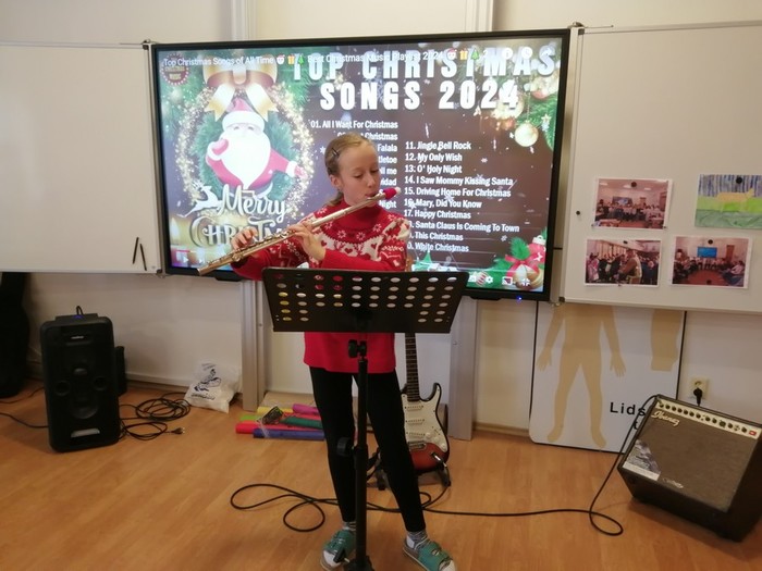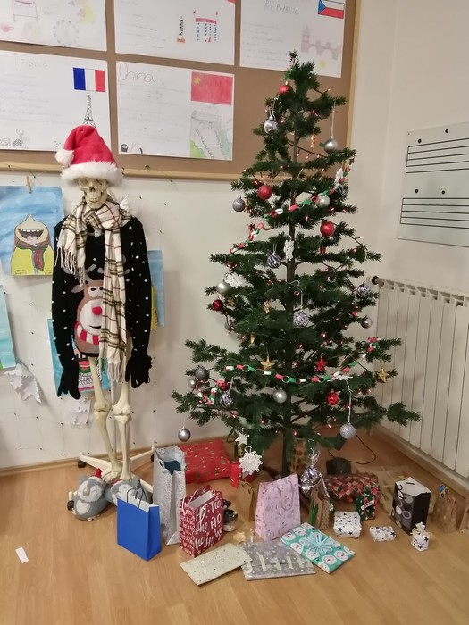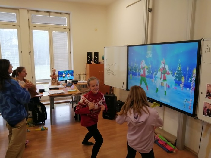 Těšení na Vánoce jsme si zpestřili zábavnými vánočními aktivitami. Ve čtvrtek jsme hráli deskové hry, vánoční kvízy Kahoot, zábavné poznávací kvízy melodií a písní z pohádek, vánoční Boomwhackers a Just Dance. V pátek 22.12 jsme měli třídní besídku, zazpívali jsme si koledy, zatančili Just Dance, rozdávali si dárky a koštovali cukroví, které jsme si napekli. Závěr vánočního dopoledne jsme strávili v bazilice, poslechli jsme si varhaní koncert a zazpívali písně.