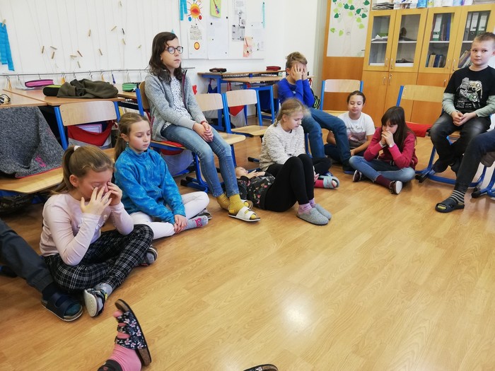 Ve čtvrtek 18. 11. 2021 k nám zavítala paní psycholožka a připravila si pro nás dvě hodiny plné her a zábavy. Nejprve jsme si procvičili neverbální komunikaci ve dvojicích. Vyměňovali jsme si místa tak, aby nám židli nezasedl kamarád stojící v kruhu. Byla to zábava a po našem přemlouvání se zapojily i paní učitelky, z čehož jsme měli velkou radost.