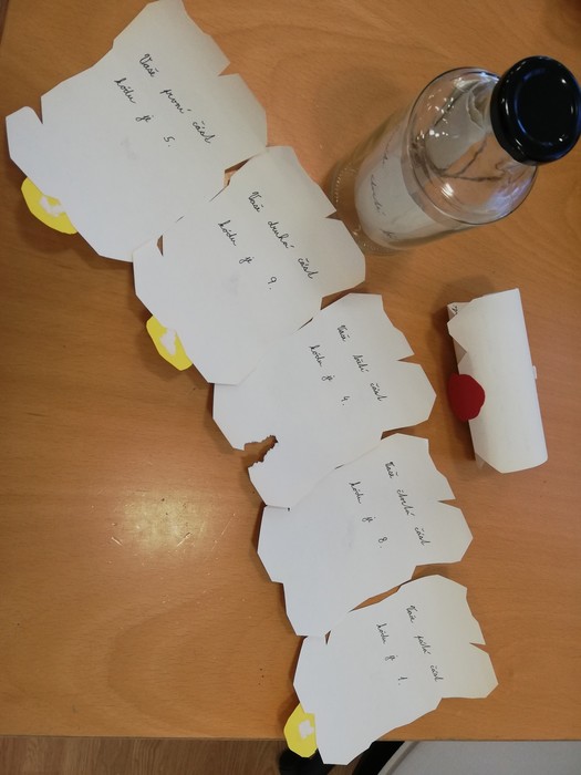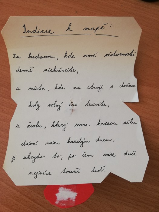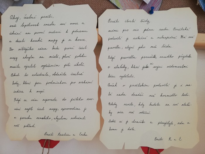 Žáci ze čtvrtého ročníku se vypravili za dalším velkým pirátským dobrodružstvím. Od jejich pirátských přátel obdrželi dva dopisy, které je připravily na nadcházející hledání indicie k prvnímu kousku mapy k pirátskému pokladu. Aby žáci získali indicii, musela každá skupina vyřešit 5 úkolů a za každý z nich získala jednu část číselného kódu k zámku od truhly s indicií. Šest kódů úspěšně odemklo truhlu s indicií a třída se vydala hledat první kousek mapy. S vynaložením velkého úsilí se třídě povedlo najít první kousek mapy a jsou tak o malý kousek blíže k celému pirátskému pokladu.