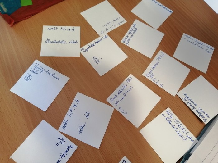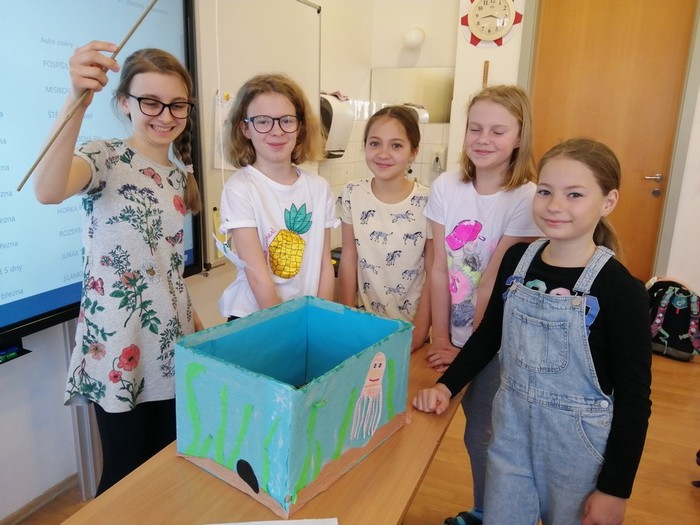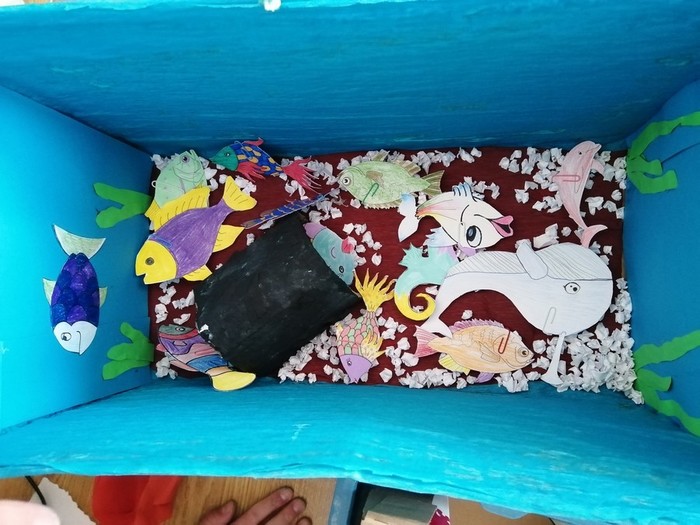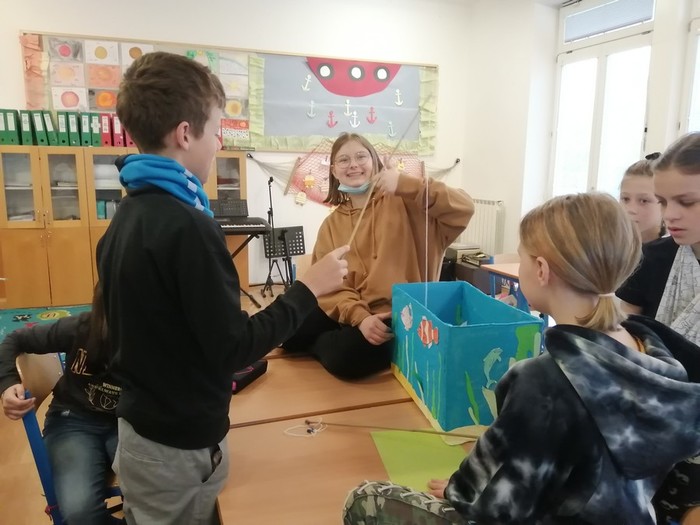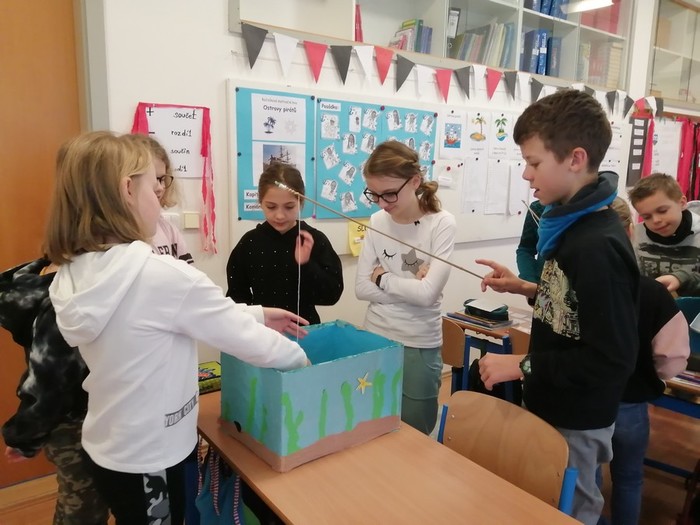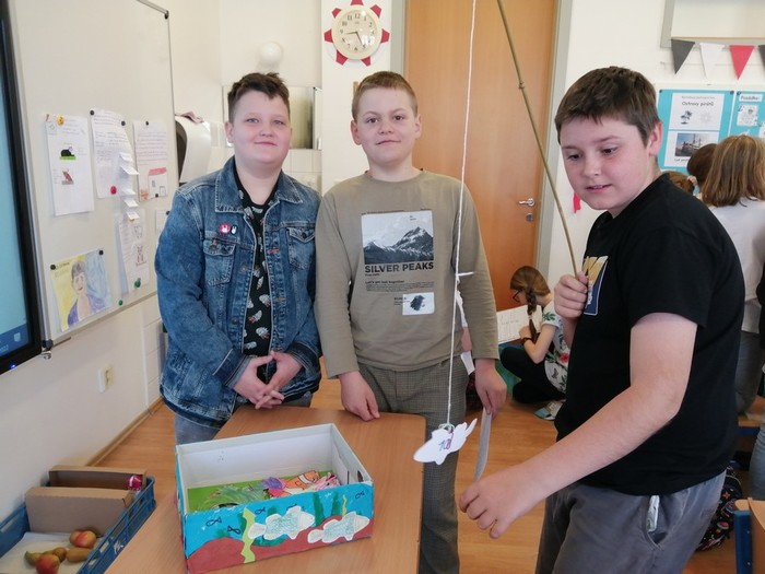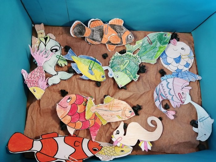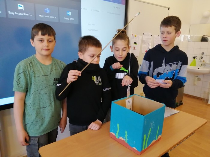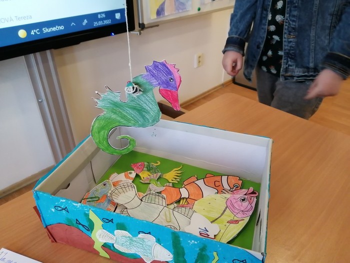 V rámci pracovních činností jsme si vyrobili učební pomůcku - akvária s rybičkami. Každá rybička má své číslo, pod kterým se skrývá úkol nebo otázka. Cílem je vylovit si rybičku a splnit úkol, či správně odpovědět na otázku. Takovým způsobem si opakujeme naučené dovednosti a vědomosti.