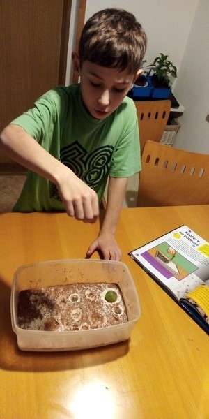 Dělali jsme pokus, jak vznikají krátery. Z mouky, co nám zbyla z kráterů, jsme udělali ozdůbky, které jsme dali do trouby vysušit. Není to na jídlo. Do mouky jsme ještě přidali vodu a ocet.