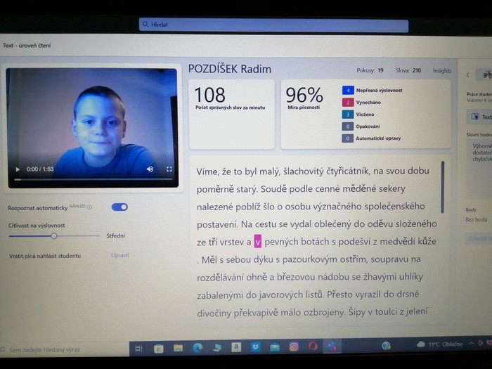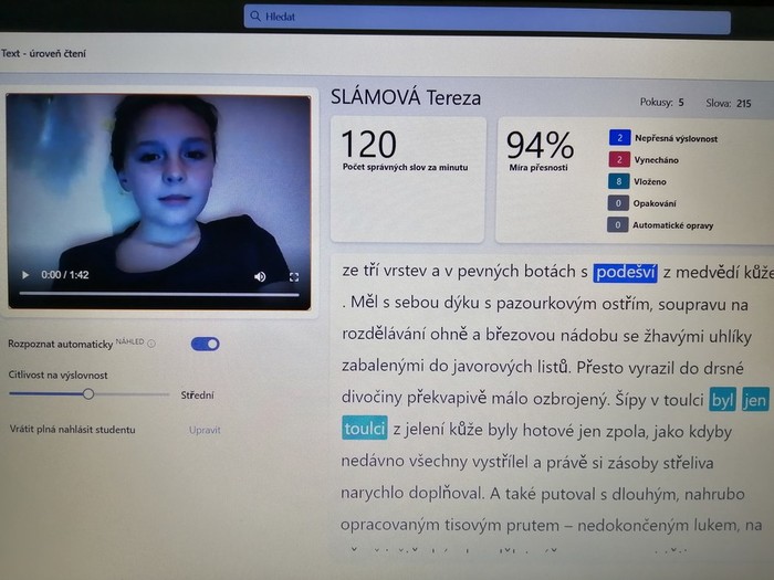 Vyzkoušeli jsme si zajímavé testování úrovně čtení pomocí aplikace Microsoft Teams. Úkolem bylo přečíst a nahrát text. Počítač pomocí umělé inteligence pak vyhodnotil naše čtení, zvýraznil chyby ve čtení a vyhodnotil, kolik slov jsme správně přečetli za minutu. Celkový výsledek pak zobrazilo procentuální hodnocení míry úrovně čtení. Zábavné také bylo se vidět a slyšet na videonahrávce.