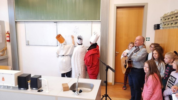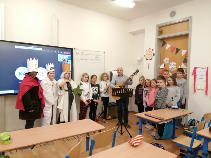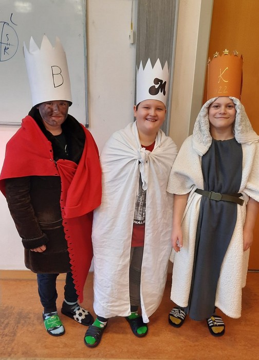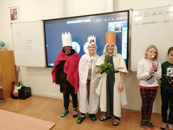 Kašpar, Melichar a Baltazar se skupinou hudebníků potěšili všechny žáky naší školy svojí návštěvou. Zazpívali s doprovodem na flétny a kytaru, napsali K+M+B 2022 a vysvětlili všem, co to znamená, požehnali všechny třídní příbytky a popřáli všem šťastný nový rok.