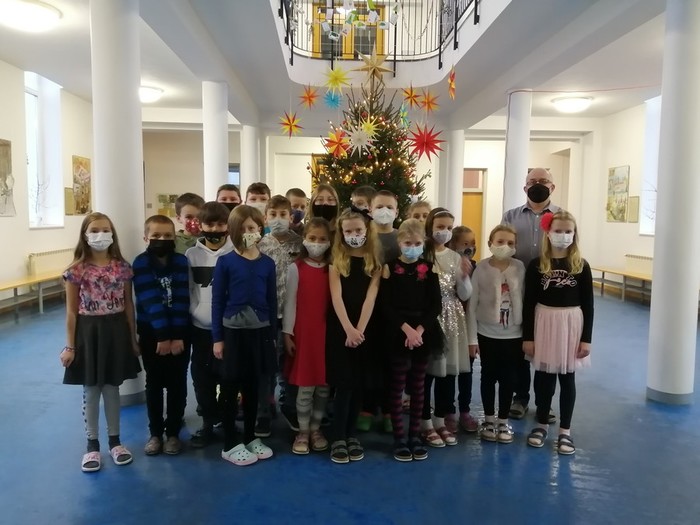 Veselé Vánoce a šťastný nový rok přejí čtvrťáci, pan učitel a paní asistentka.