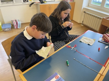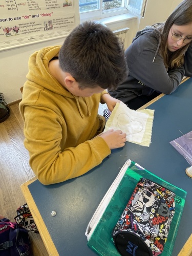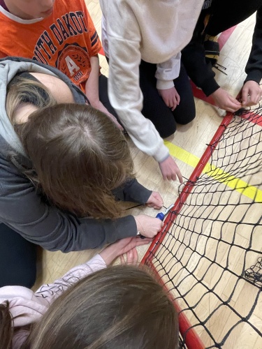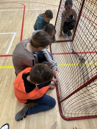 V rámci pracovních činností se žáci pustili pod dohledem paní asistentky do vyšívání srdíček a ti rychlejší stihli ještě navíc, provést revizi florbalových branek.