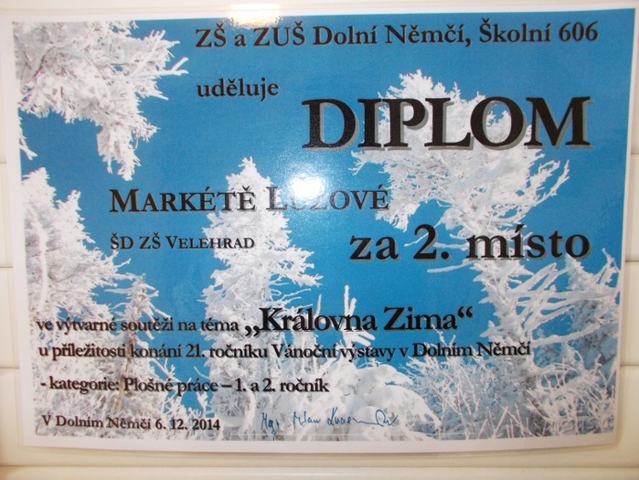 SOUTĚŽE SE ZÚČASTNILO CELKEM 14 ŠKOL, BYLY ZASLÁNY STOVKY VÝKRESŮ I PROSTOROVÝCH PRACÍ. ŽÁKYNĚ NAŠÍ ŠKOLY MARKÉTA LUŽOVÁ V SILNÉ KONKURENCI V KATEGORII 1. – 2. TŘÍD ZÍSKALA 2. MÍSTO. PORTRÉT ZIMNÍ KRÁLOVNY VYTVÁŘELA VE SLUNÍČKOVÉ DRUŽINĚ KOMBINOVANOU TECHNIKOU ROZMAZOVÝCH KŘÍD A KLOVATINY, POD VEDENÍM PANÍ VYCHOVATELKY J. KAVKOVÉ. DOSTALA KRÁSNÝ DIPLOM A ODMĚNU. MARKÉTCE PŘEJEME HODNĚ DALŠÍCH VÝTVARNÝCH NÁPADŮ!