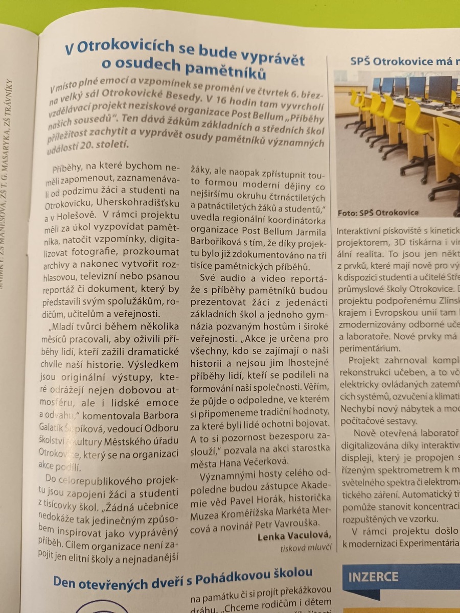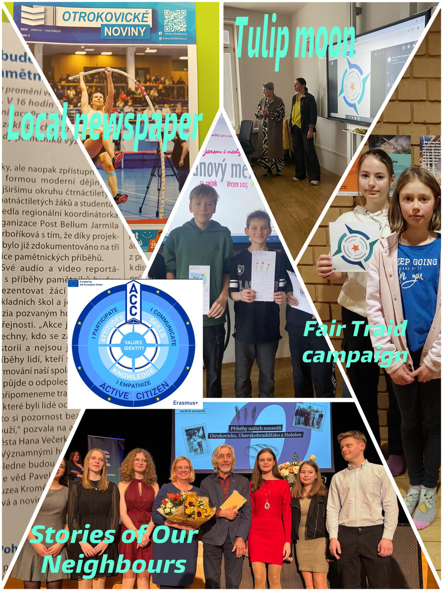 The school is involved in the Stories of our Neighbours project. It promotes active citizenship through its participation, where pupils map the story of a selected fellow citizen and make a video. We were able to present our international Erasmus ACC project as part of this project. This was done not only during the actual presentation of the story of Igor Stránský, director of the Slovácké Theatre and fighter against communism, but also by publishing an article in the newspaper. We believe that the transfer of experience between generations is the most natural way of education. No textbook can inspire in such a unique way as a story told.