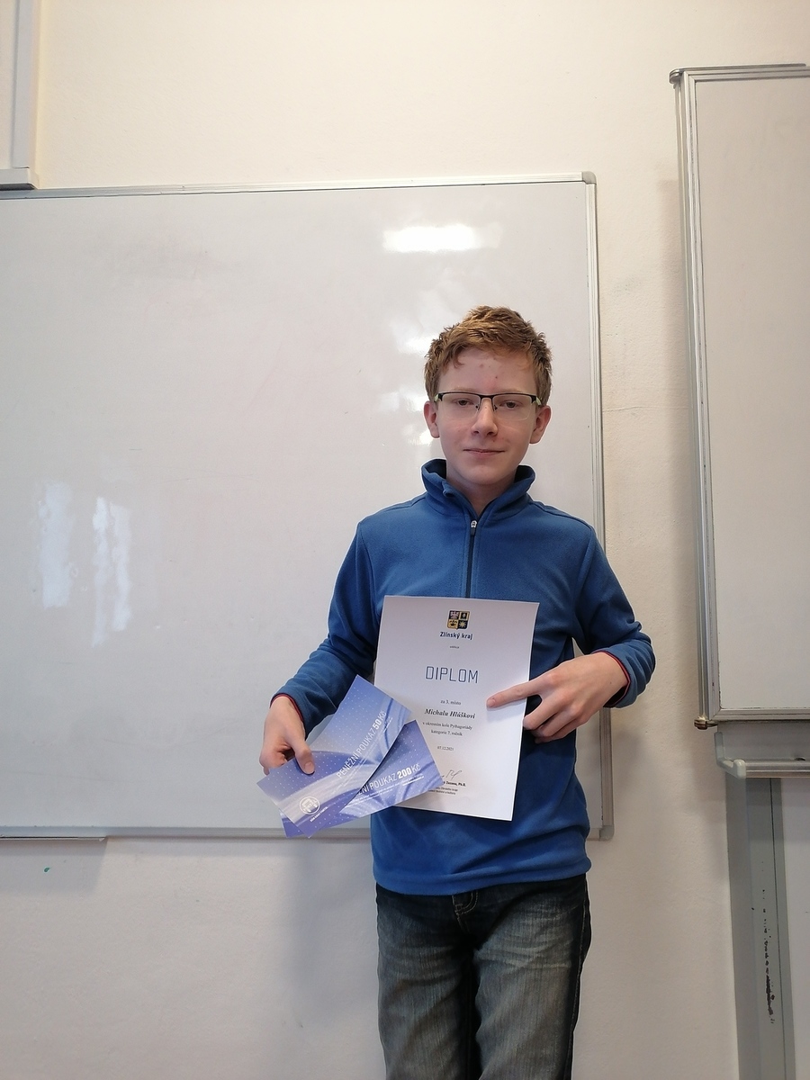 Od vyučující matematiky Michal tento týden převzal diplom a cenu a my mu ještě jednou gratulujeme a děkujeme za reprezentaci školy. Michale, ať Tě matematika i nadále baví!