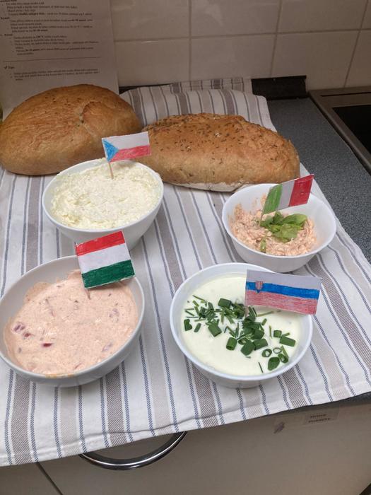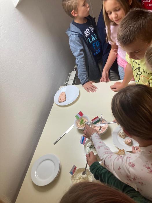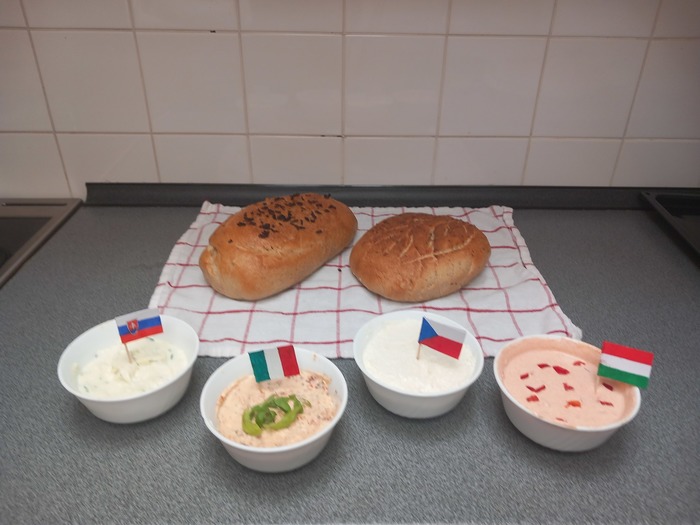 Mladší žáci ze 4. a 5. tříd navázali tvorbou plakátů s recepty a praktickou částí – přípravou pomazánek, které reprezentovaly jednotlivé země. Na stolech se tak objevily chutě celé Evropy: česká tvarohová, italská rajčatová, maďarská papriková a slovenská bylinková pomazánka. Společná ochutnávka se proměnila v okamžik sdílení, spolupráce a respektu k rozmanitosti – hodnot, které jsou jádrem evropského vzdělávání.