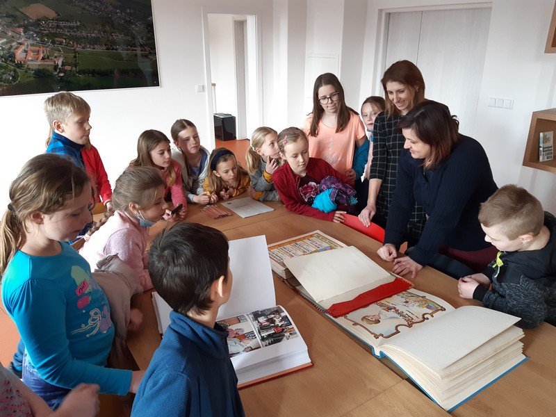 Minulost a současnost naší obce bylo téma, které nás přivedlo na Obecní úřad ve Velehradě. V nově zrekonstruované obřadní síni nás oficiálně přivítal pan starosta Aleš Mergental a paní účetní Jana Březinová. Díky nim se děti seznámily s historií naší obce a zjistily, proč se v obecním znaku objevuje hlava moravské orlice. Zároveň si prakticky vyzkoušely, jak funguje obecní zastupitelstvo a proč musí být počet členů lichý. Pan starosta nám dovolil nahlédnout do své kanceláře a odkryl nejedno tajemství. Prošli jsme budovou do vyšších pater a v zasedací místnosti jsme nahlédli do matričních knih z let 1972 - 1982. Leckteré z dětí tam našlo jména svých rodičů a příbuzných. Paní učitelka dokonce zápis o svém vlastním narození. Nádherné ručně malované ilustrace byly zároveň ukázkou mistrovského výtvarného nadání pana učitele Fajkuse, který se o zápisy staral. S sebou si děti odnesly křížovku a tužku s logem obecního úřadu.