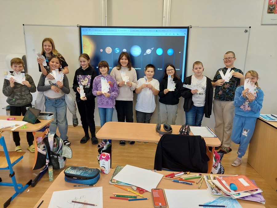 Do učení jsme zapojili také pohyb – zahráli jsme si pohybovou hru na téma vesmír, která nás zábavnou formou přiblížila k planetám a dalším objektům ve vesmíru. Při čtení s porozuměním jsme pracovali s texty o vesmíru a rozvíjeli tak nejen znalosti, ale i čtenářské dovednosti. V rámci badatelské výuky jsme se ponořili do příběhů prvního člověka ve vesmíru a na Měsíci, zkoumali fakta, kladli si otázky a hledali odpovědi.