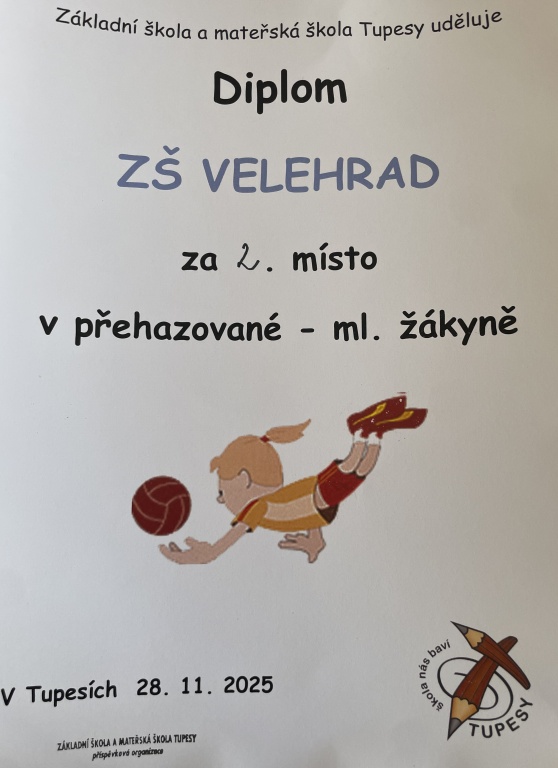 Dnes se výběr děvčat ze 6. a 7. třídy zúčastnil každoročního turnaje v přehazované v sousedních Tupesích. Naše hráčky předváděly parádní výkony. Celkem odehrály 4 zápasy, ve kterých 3x zvítězily a 1x našly přemožitelky ze ZŠ a MŠ Osvětimany. Tento zápas byl napínavý od začátku až dokonce. Bohužel nám nevyšla koncovka druhého setu a prohráli jsme nejtěsnějším možným rozdílem 24:25. Nicméně děkuji našim děvčatům za skvělou reprezentaci školy a odvážíme si tedy krásné 2. místo.