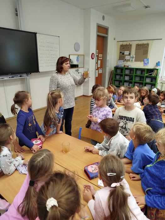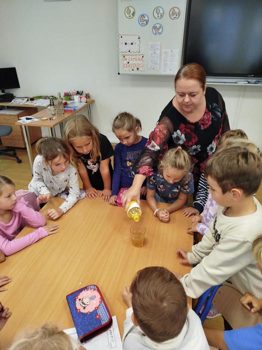 Proč plavou mastná oka v polévce? Co je těžší - olej, med nebo voda? Který předmět se nepotopí a bude plavat na hladině? To je spousta otázek, na které žáci 1.A a 1.K hledali odpovědi. Pokus si vyzkoušeli na vlastní kůži a obrázkový postup nalepili do svých badatelských deníků. A pro lepší zapamatování pokusu žákům pomohla básnička.