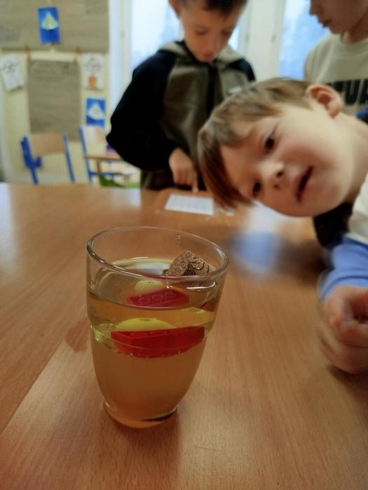 Proč plavou mastná oka v polévce? Co je těžší - olej, med nebo voda? Který předmět se nepotopí a bude plavat na hladině? To je spousta otázek, na které žáci 1.A a 1.K hledali odpovědi. Pokus si vyzkoušeli na vlastní kůži a obrázkový postup nalepili do svých badatelských deníků. A pro lepší zapamatování pokusu žákům pomohla básnička.