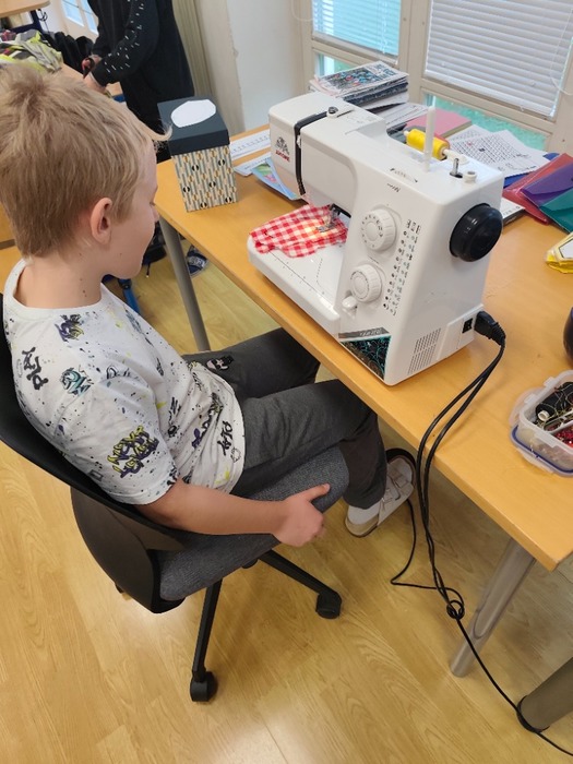 Každý čtvrťák si vyzkoušel šití na šicím stroji a odnesl si vlastní přívěsek na klíče. Děti se zároveň naučily, jak ocenit svůj výrobek – zvažují, co všechno se do ceny musí započítat: materiál, čas i práce rukou.